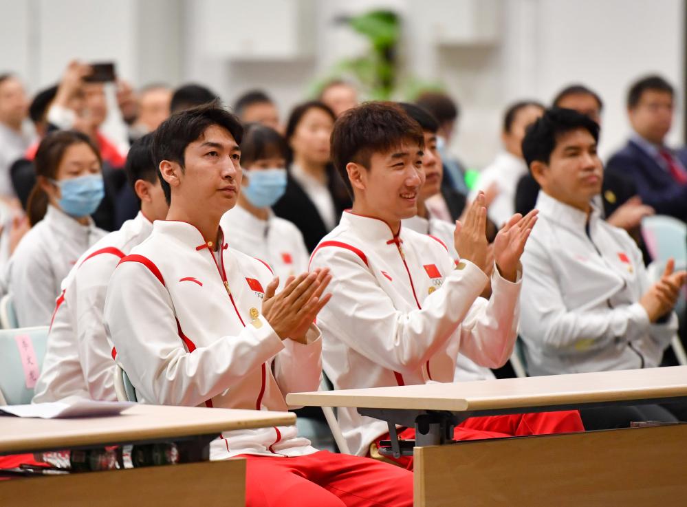 这是2023年5月13日,短谈速滑指引员武大靖(前左)和速率溜冰指引员高亭宇在米兰冬奥会倒计时1000天责任部署动员大会上。新华社记者 宋彦桦 摄