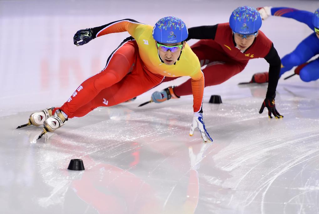 这是2016年1月21日,吉林队选手武大靖(左)在在第十三届宇宙冬季指引会短谈速滑男人500米决赛中。最终,他夺得冠军。 新华社记者 夏一方 摄