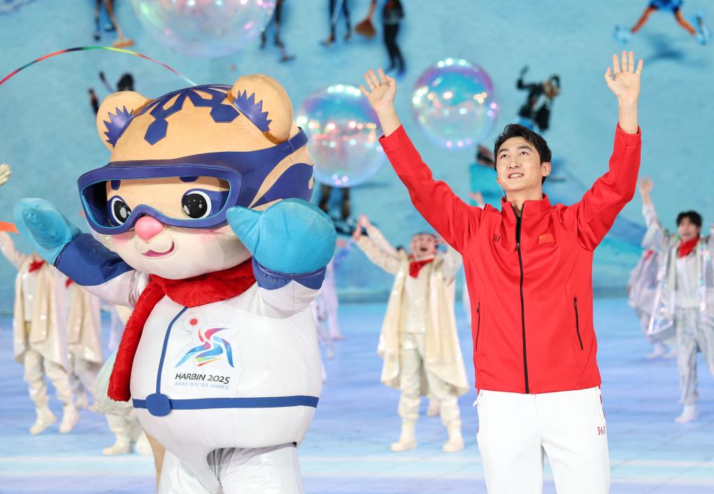 这是2025年2月7日,奥运冠军武大靖(前右)在第九届亚洲冬季指引会开幕式上。新华社记者 黄伟 摄