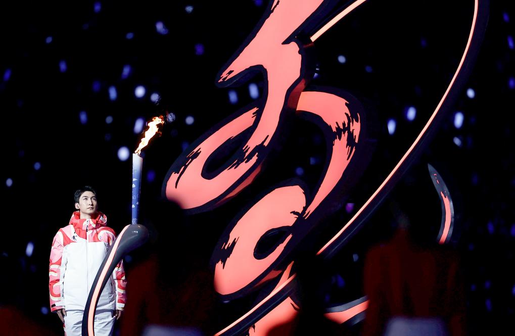 这是2024年2月17日,火把手武大靖在第十四届宇宙冬季指引会开幕式上点火主火把。新华社记者 黄伟 摄