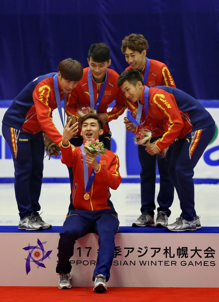 这是2017年2月22日,中国队选手武大靖(前)在第八届亚洲冬季指引会短谈速滑男人5000米勤奋受奖典礼后与队友自拍贪恋。中国队夺得冠军。新华社记者 杨世尧 摄