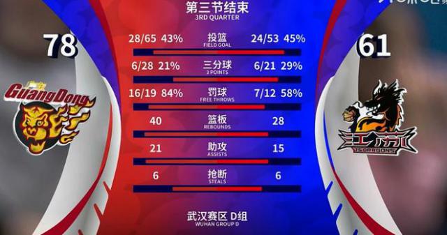 江苏第三节开局打得可以,在亨特得分断电的情况下,原土球员基本齐站了出来,和双外助广东队打得有来有回,第三节 4 分 36 秒,广东队才由杜润旺射中下半场的第一记三分,与此同期,奎因也吃到 5 犯被罚下,杜锋有些不信邪,第三节后半段也随着易立彼此斗起了全华班。