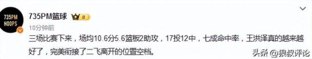 昔日 3 场 CBA 杯赛,王洪泽,场均 10.6 分 5.6 篮板 2 助攻,17 投 12 中,七成射中率,王洪泽真实越来越好了,完满衔尾了二飞离开的位置空档。