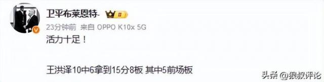 全场比赛,王洪泽首发登场 26 分钟,10 投 6 中,三分 2 中 1,得到 15 分 8 篮板 3 助攻,其中高达 5 个紧迫篮板球,屡次匡助广东男篮赢得二次得分的契机。