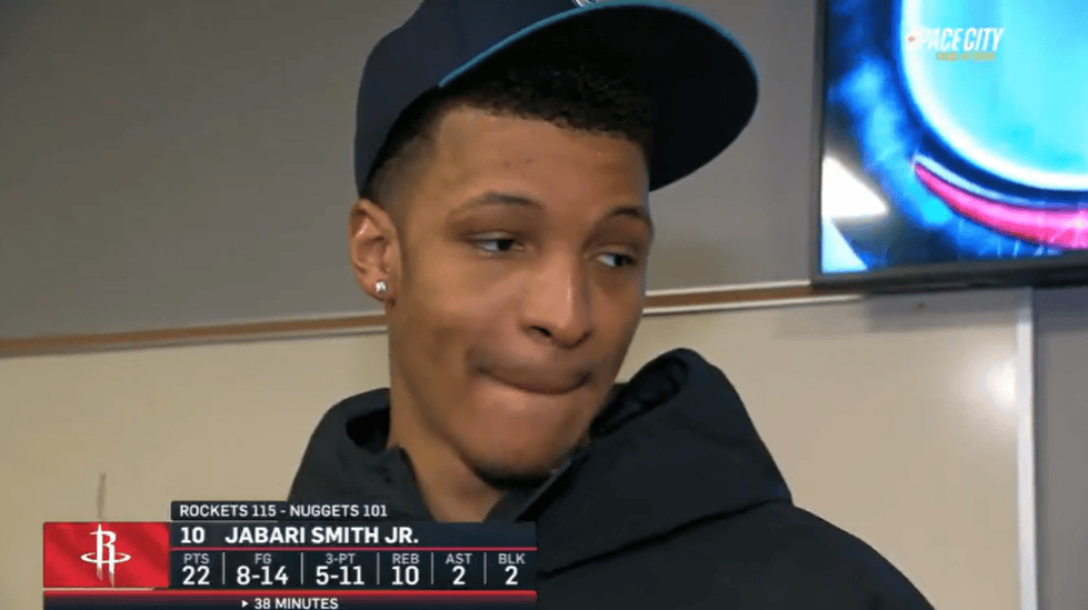火箭球员贾巴里-史姑娘本场比赛首发登场38分钟,全场14投8中,三分11中5,罚球2中1砍下22分10篮板2助攻2封盖。
